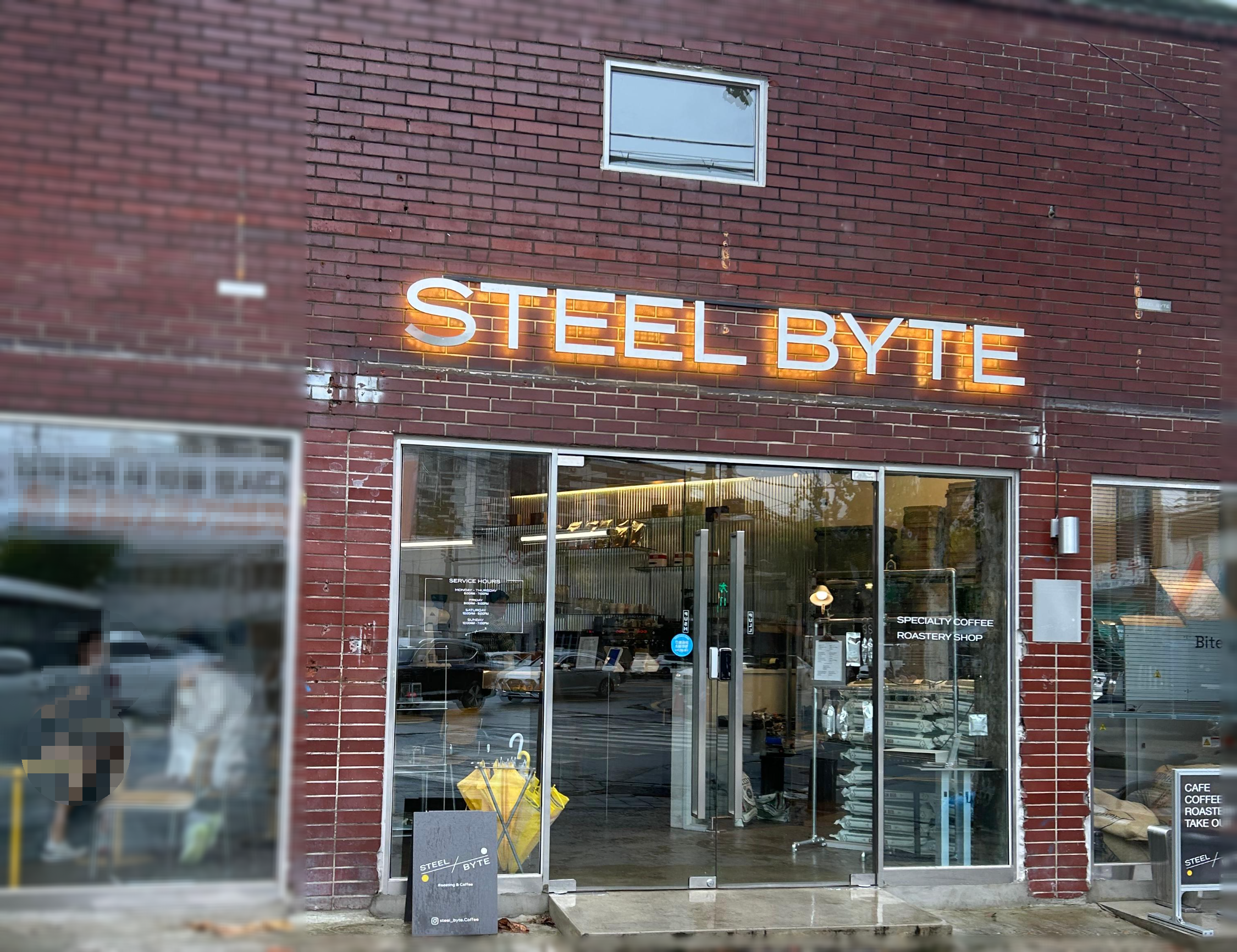 붉은 벽돌 건물에 주황빛 네온사인으로 STEEL BYTE(스틸바이트)가 딱 눈에 들어오고,